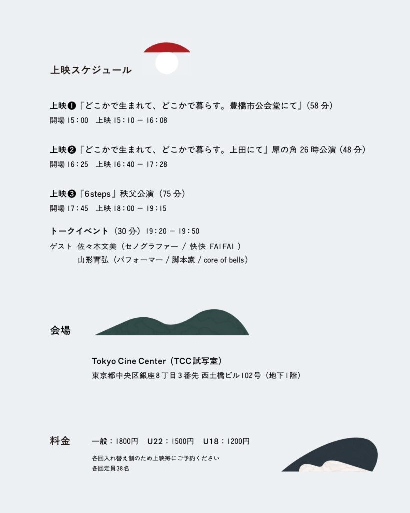 豊橋、東京、別府にて上映会を実施。60分の上映会の後にはダンスが他者のカメラ(視点)によって解釈し直されることをテーマに意見交換会・勉強会も行った。今後も上映会を継続的に企画し、舞台芸術に関わる人、関わっていない人、様々な職業・活動をされている方と言葉を交わす機会を作っていくことを試みる。